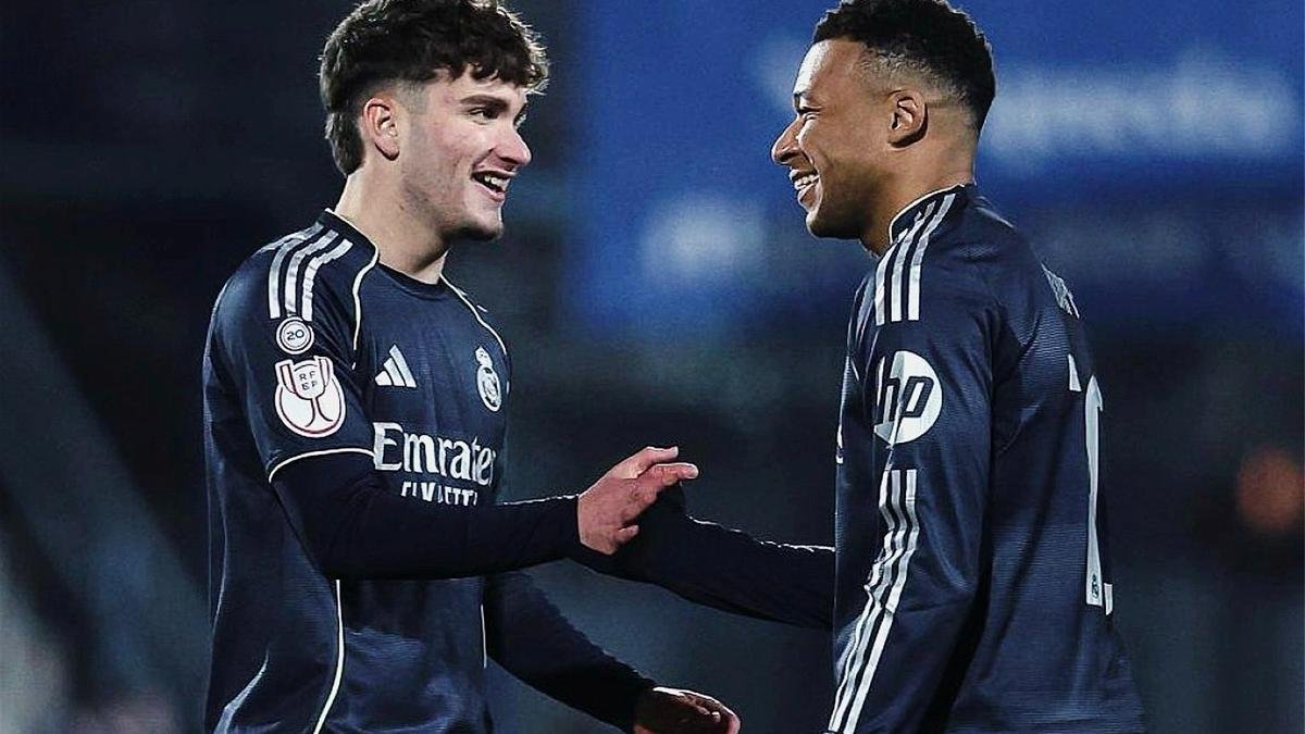 Jorge Cestero, este miércoles tras debutar con el Real Madrid, junto a Mbappé. / .