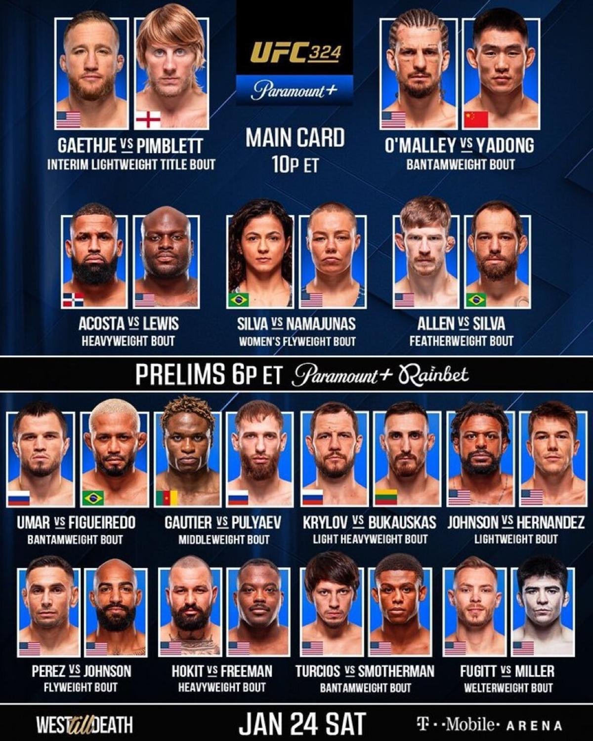 El UFC 324 se disputa en la madrugada del sábado 24 al domingo 25 de enero de 2026 en el T-Mobile Arena de Las Vegascon Paddy Pimblett y Justin Gaethje peleando por el interino del peso ligero en el combate estelar. Para los aficionados españoles, la velada arrancará de madrugada: los primeros preliminares están previstos para las 23:00 horasla cartelera preliminar comenzará en torno a las 01:00 y la cartelera estelar dará inicio a partir de las 03:00 de la madrugada (hora peninsular).