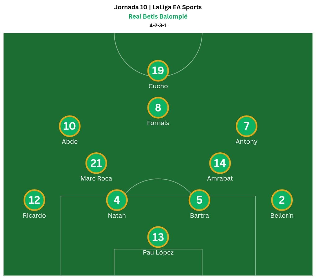 En la parcela ofensiva, el tridente formado por Antony, Abde y Cucho Hernández se han consolidado en el once por méritos propios. Los tres atraviesan un gran momento de forma y se han ganado la confianza de Pellegrini para sostener el ataque del Betis. El brasileño aporta desequilibrio por la derecha, el extremo marroquí explosividad por la izquierda y el colombiano efectividad en el área.