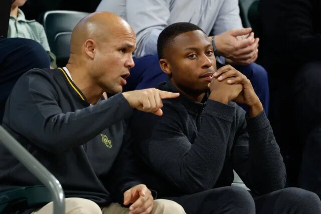 Baloncesto de la NCAA: Estado de Iowa en Baylor7 de enero de 2026; Waco, Texas, Estados Unidos; DJ Lagway, un mariscal de campo de Florida actualmente en el portal de transferencias, se sienta con el entrenador en jefe de fútbol de los Baylor Bears, Dave Aranda, a la izquierda, durante la primera mitad de un juego entre los Baylor Bears y los Iowa State Cyclones en Paul y Alejandra Foster Pavilion. Crédito obligatorio: Chris Jones-Imagn Images