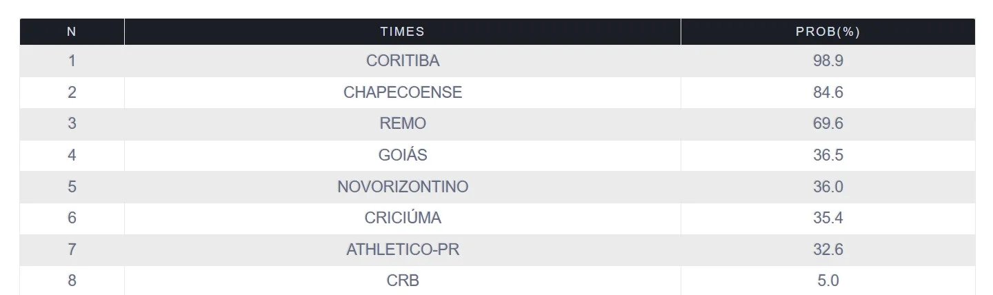 Sin embargo, todavía hay al menos cuatro equipos prácticamente empatados en posibilidades: Goiás (36,5%), Novorizontino (36%), Criciúma (35,4%) y Athletico Paranaense (32,6%).