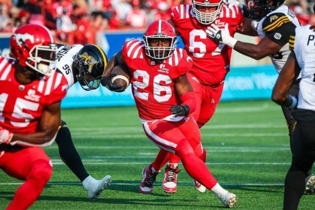 7 de junio de 2025; Calgary, Alberta, Canadá; Calgary Stampeders corriendo detrás Dedrick Mills (26) corre con el balón contra los Hamilton Tiger-Cats durante la segunda mitad en el estadio McMahon. Crédito obligatorio: Sergei Belski-Imagn Images Los Calgary Stampeders continuarán su búsqueda de la ventaja de local en la semifinal del Oeste cuando visiten al rival provincial Edmonton Elks el viernes por la noche.