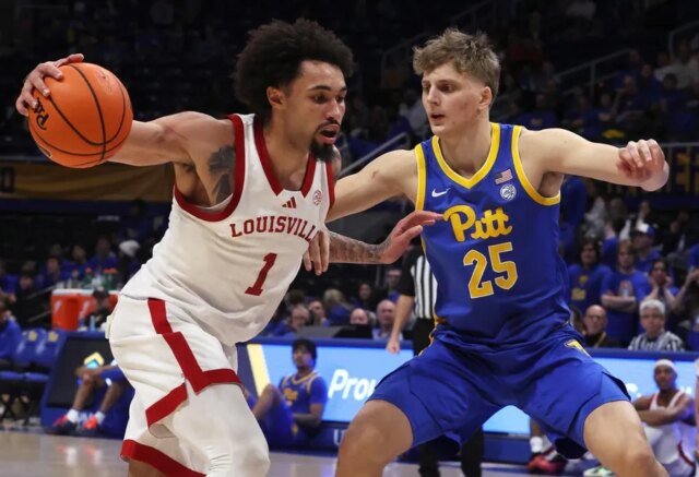17 de enero de 2026; Pittsburgh, Pensilvania, Estados Unidos; El guardia de los Cardinals de Louisville, J’vonne Hadley (1), dribla el balón mientras el guardia de los Panthers de Pittsburgh, Nojus Indrusaitis (25), defiende durante la segunda mitad en el Petersen Events Center. Crédito obligatorio: Charles LeClaire-Imagn Images Louisville se prepara para un importante enfrentamiento de la Conferencia de la Costa Atlántica con Virginia Tech el sábado, aunque reconoce dos elementos incontrolables: las lesiones y el clima.