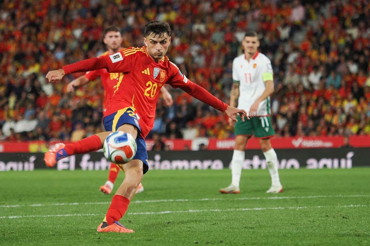 VALLADOLID, 14/ 10/ 2025- El centrocampista de la selección española de fútbol Pedri dispara a puerta en el partido de clasificación para el Mundial 2026 que los combinados nacionales de España y Bulgaria disputan este martes en el estadio José Zorrilla, en Valladolid. EFE/R. García / R. García/ EFE
