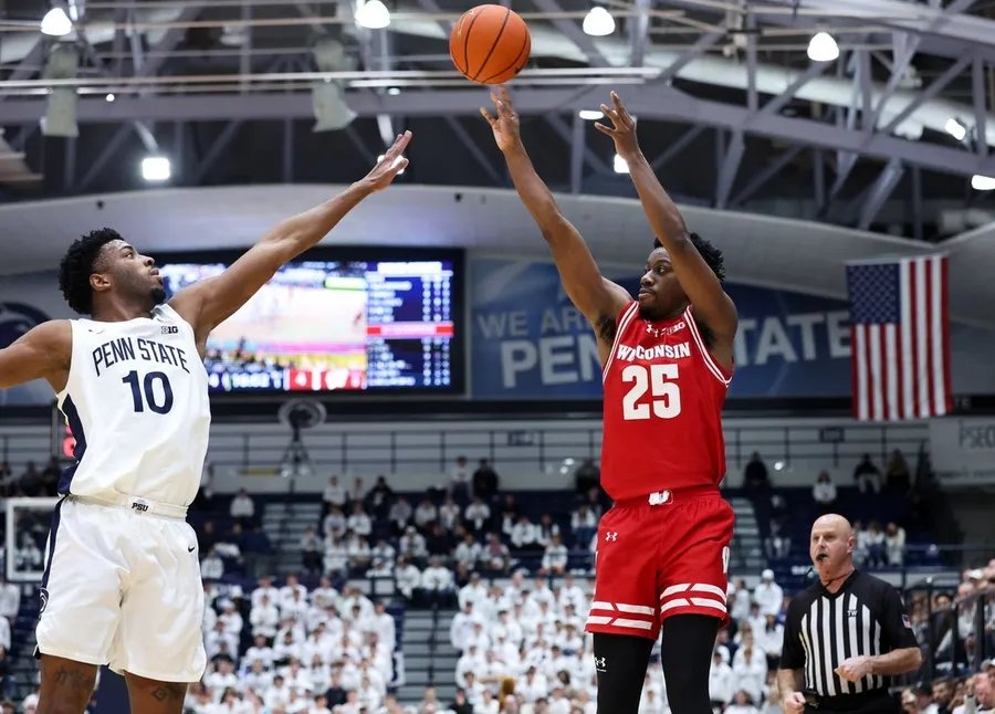 22 de enero de 2026; University Park, Pensilvania, Estados Unidos; El guardia de Wisconsin Badgers, John Blackwell (25), intenta un tiro de tres puntos mientras el delantero de los Leones Nittany de Penn State, Josh Reed (10), defiende durante la primera mitad en Rec Hall. Crédito obligatorio: Matthew O’Haren-Imagn Images John Blackwell y Braeden Carrington anotaron 17 puntos cada uno mientras Wisconsin lograba una victoria 98-71 sobre Penn State en un concurso Big Ten el jueves por la noche en State College, Pensilvania.