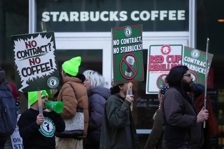 Los trabajadores de Starbucks se han declarado en huelga varias veces en los últimos años, a partir de 2021. Los trabajadores de una ubicación en Buffalo, Nueva York, se convirtieron en la primera tienda sindicalizada y posteriormente lanzaron un movimiento a nivel nacional, que ahora representa el cuatro por ciento de la fuerza laboral de los cafés Starbucks, o alrededor de 9.500 personas.