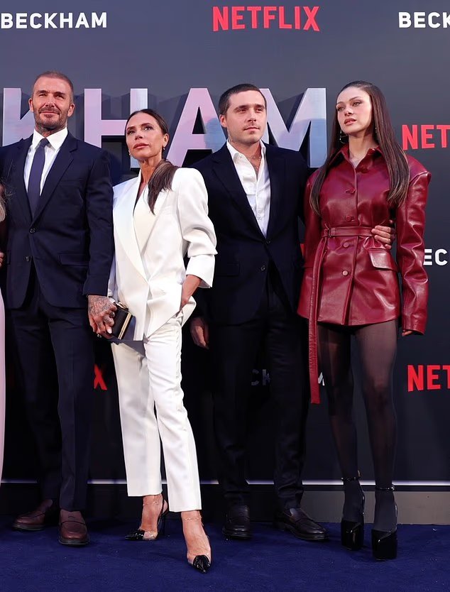 Brooklyn Beckham y Nicola Peltz, extrema derecha, lucen tristes ante el estreno de David en Netflix en 2023