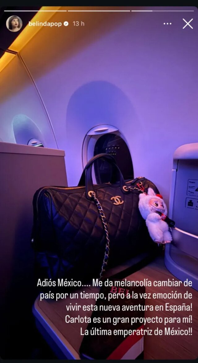 La cantante y actriz Belinda ya se ha subido en un avión con rumbo a Españapaís en el que vivirá temporalmente por proyectos profesionales. A través de su cuenta de Instagram hizo oficial la mudanza.