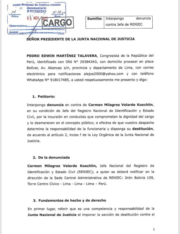 “Interpongo denuncia en contra de Carmen Milagros Velarde Koechlin, en su condición de jefa del Registro Nacional de Identificación y Estado Civil, por la incursión en conductas que comprometen la dignidad del cargo y lo desmerecen en el concepto público”, señala el oficio presentado por Martínez.