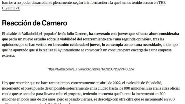 En el apartado de “Justificación de la oferta seleccionada o imposibilidad de obtener tres ofertas” el Ayuntamiento alega que el motivo de la selección de la adjudicataria es “por no ser una productora convencional, pues ofrece dos plataformas para su difusión en el ámbito nacional”. En concreto, dice, “gestiona la delegación en Valladolid de dos medios de comunicación: La Jungla Radio, que tiene 11.000 seguidores en Facebook, Instagramn (sic) y X, y el medio nacional The Objetive (sic). ”Los contenidos serán publicados en los dos medios nacionales franquiciados: The Objetive (sic) y La Jungla“. En el contrato se justifica la no ampliación de la oferta a dos empresas más, ”porque Ramda Comunicación es la única productora que gestiona los dos citados medios de comunicación en Valladolid, por tanto ninguna otra empresa podría competir. Por ello se tramita al margen del acuerdo marco“, finaliza.