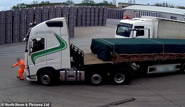 Imágenes impactantes muestran al gerente, vestido con ropa de trabajo de color naranja fluorescente, acercándose a la cabina del camión, antes de que Ley cierre la puerta.
