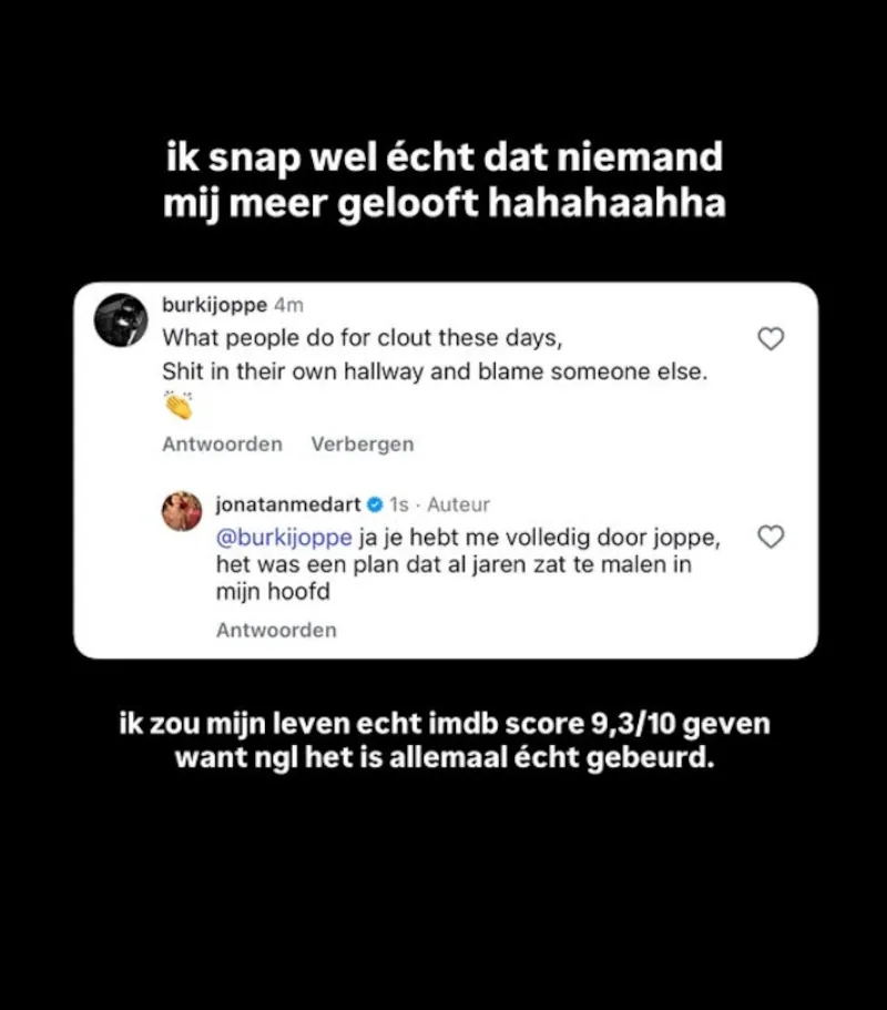 La historia continúa, pues Jonatan volvió a responder un poco más tarde a través de sus redes sociales. Se dirigió a seguidores que al parecer no le creen. Al principio le ve humor: “Realmente comprendo que la gente ya no me crea”, bromea. “Le daría a mi vida una puntuación de 9,3/10 en IMDB porque todo sucedió realmente”.
