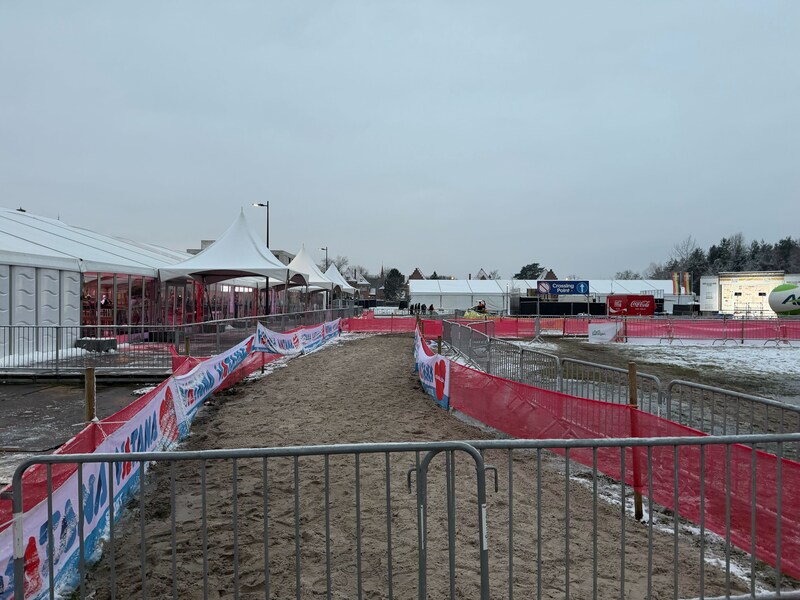 Durante las carreras de hoy se eliminó del recorrido una franja de 300 a 400 metros. No porque fuera demasiado peligroso, sino porque el agua estaba demasiado fría, lo que provocaría hipotermia a los ciclistas. La organización abordó el problema. Se entregó mucha arena a Beringen. La franja estará en el campo mañana.