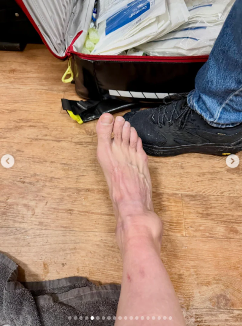Van Aert también mostró fotos de cómo tuvo que vivir con un hueso alrededor de su pie derecho la semana pasada y cómo tuvo que estirarse y mirar el centro desde su asiento. Al final, Van Aert muestra cómo luce actualmente su tobillo, lleno de hematomas.