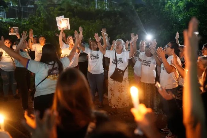 Familiares de presos políticos realizan una vigilia pidiendo la liberación de sus seres queridos afuera de la prisión Rodeo I en Guatire, Venezuela. (Foto: Matías Delacroix/ AP)