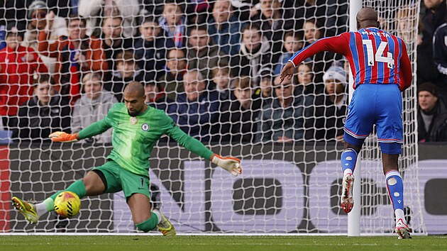 El portero Robert Sánchez del Chelsea salva contra Jean-Philippe Mateta del Crystal Palace.