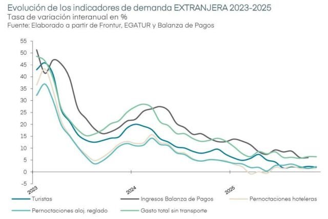 Esta asociación también destaca que la presión media diaria de los turistas en España está bajando, lo que se está traduciendo en menos protestas por la saturación y en menos viviendas de uso turístico, que el absentismo laboral “está desbocado” y que la productividad del sector crece.