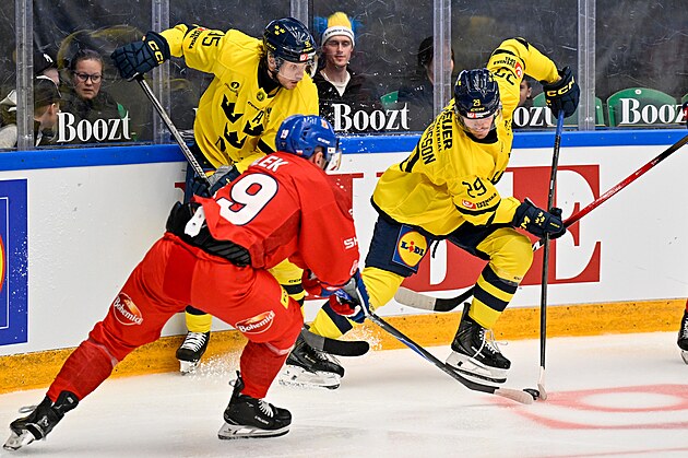 Jakub Flek intenta defender el disco frente a Jacob de la Rose y Axel Andersson.