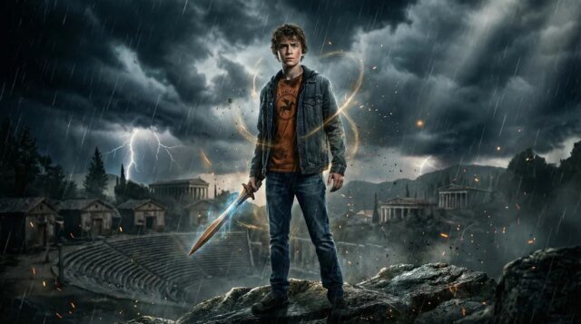Mi nombre es Percy Jackson. Hasta ahora, pensaba que era un chico corriente al que estaban a punto de ser expulsados de la escuela. Pero descubrí que mi padre es un dios del Olimpo. (Ilustración con imágenes de Percy Jackson y los dioses del Olimpo, 2023, Disney Plus). | Blesk – Nano Banana AI, idh