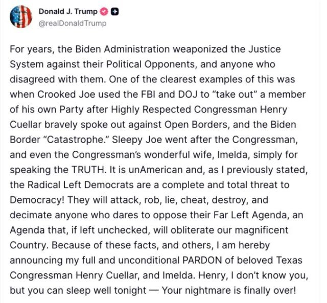 El indulto beneficia también a la esposa del congresista, Imelda Cuéllar, señaló el mandatario, quien utilizó su comunicado para criticar al expresidente Joe Biden, acusándolo de utilizar al Departamento de Justicia como arma contra sus oponentes políticos.