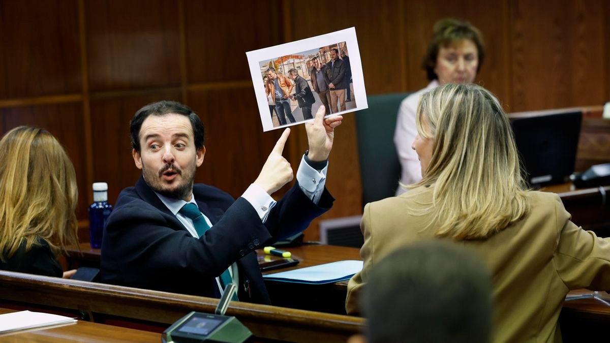 Alejo Miranda enseña muy contento a sus compañeros una foto en la que aparecen Sánchez, Ábalos y Cerdán en las primarias del PSOE.