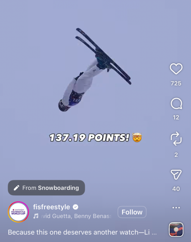 El algoritmo de Meta etiquetó un clip de esquí como “snowboard”. (Captura de pantalla vía Instagram)