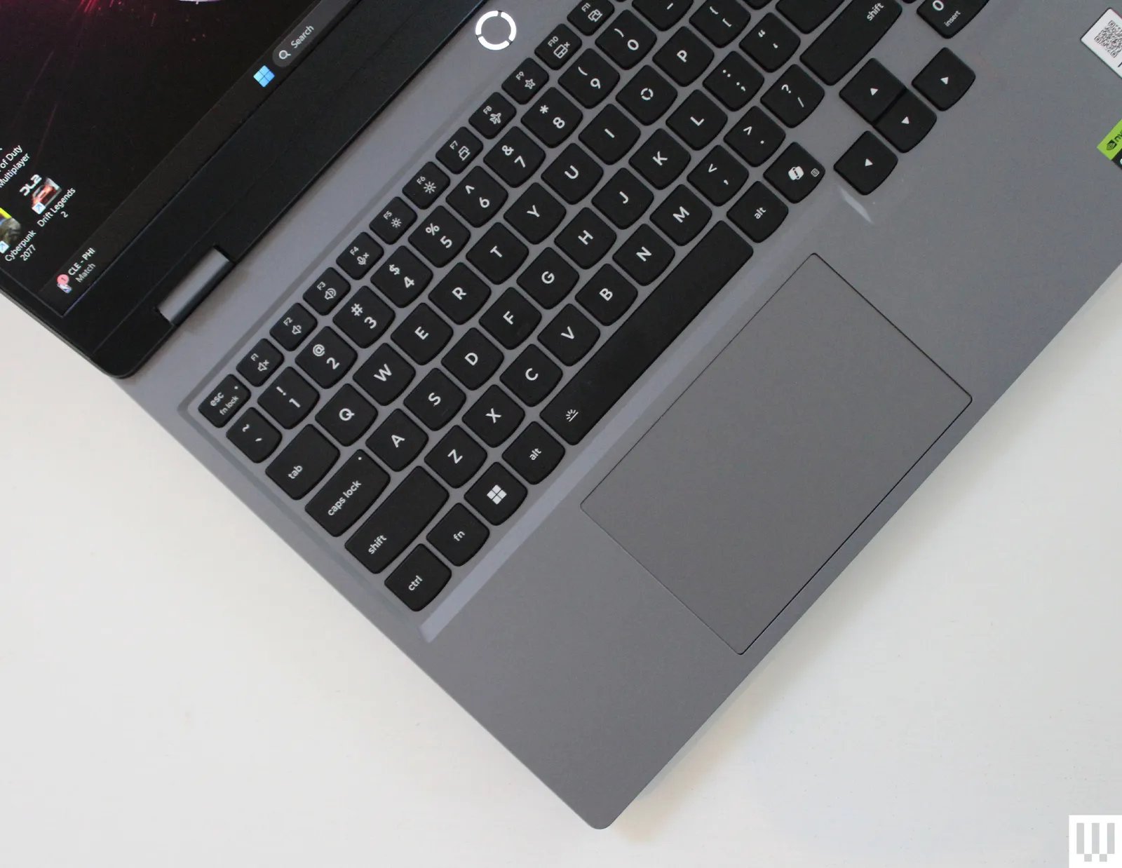 Los paneles táctiles y los teclados a menudo se ven comprometidos en máquinas más baratas, pero no aquí. Los interruptores del teclado de 1,5 mm parecen tener un punto de actuación bajo, que se combina con teclas rígidas, lo que le da una sensación muy precisa. Puede que me cueste un poco acostumbrarme, pero prefiero esto a las teclas blandas que se encuentran en muchas computadoras portátiles para juegos baratas. El diseño es espacioso y ofrece un teclado numérico de 10 teclas, control multimedia y teclas de flecha de tamaño completo. Lo único que le falta es un lector de huellas dactilares o una cámara de infrarrojos. El LOQ 15 no es compatible con Windows Hello, por lo que tendrás que confiar en una contraseña. Tiene un panel táctil grande y sorprendentemente sensible, cuya superficie se siente agradable y suave al arrastrar el dedo. Sin embargo, el clic es demasiado fuerte.